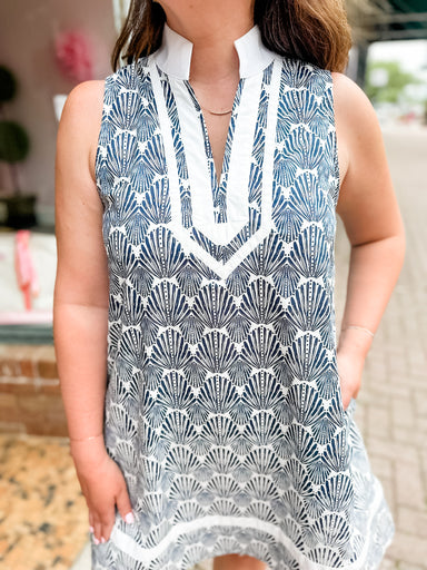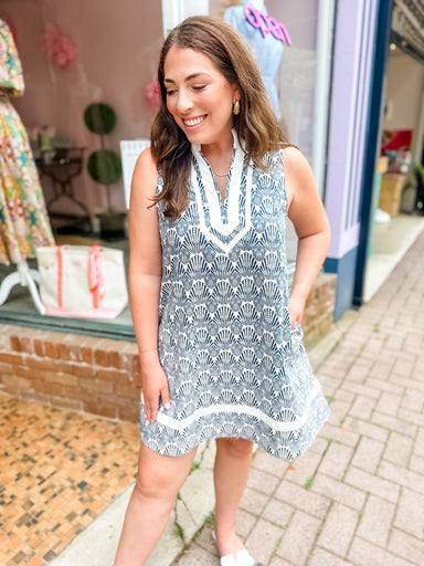Sail into summer in our “nautical pearl dress!” Nautical with the navy and seashells and timeless with the classic crisp white high collar and trim...