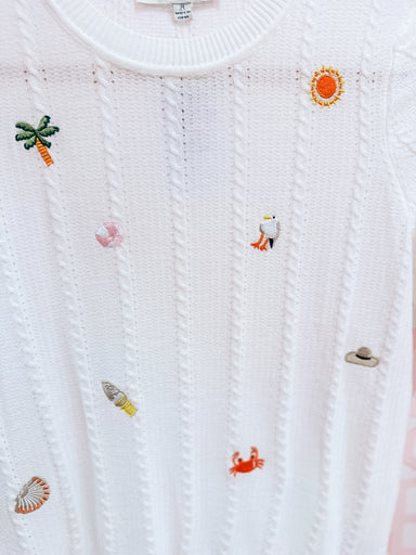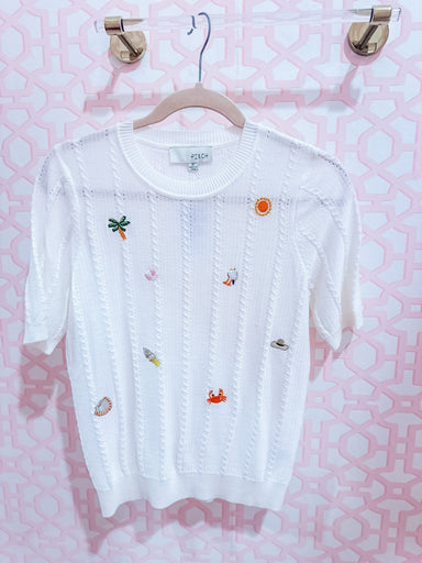 Spend a day at the beach in this pretty lightweight sweater! It features a short sleeve and a simple crew neckline with beach items stitched all ov...
