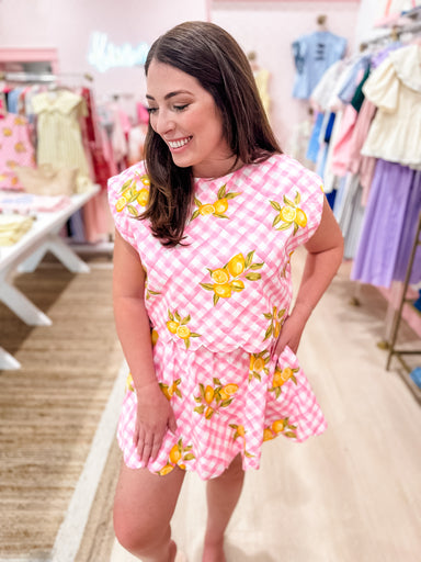 You will find a little tart and a whole lot of heart is this sweet set!! We love how the yellow lemons op on the pink gingham! This set features a ...