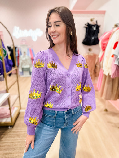 Be the queen of Mardi Gras in this fun purple cardigan! It is a lightweight knit covered in crowns stitched in sparkly sequins! The cardigan sweate...
