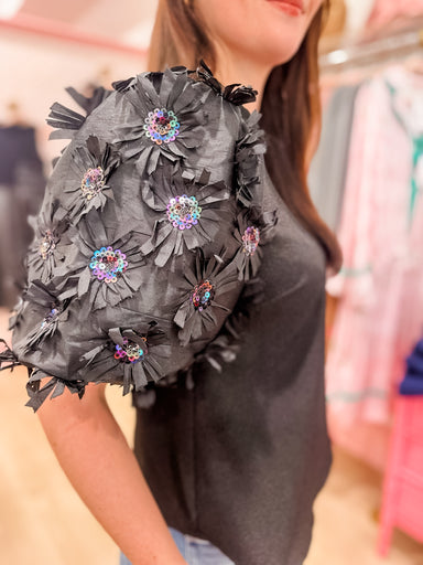 Feel fancy in our "crystal collar couture top!" This top will make a statement wherever you go! It features a cap sleeve with crystals around the n...