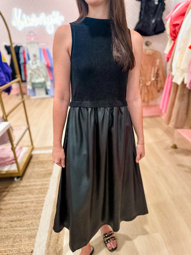 Our "mixed media" dress is the best of both worlds. It is classy at the top and sexy at the bottom! The top of the midi length dress is sleeveless ...