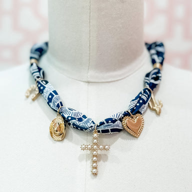Bandana necklaces are the trend of the season! Fun and unique and a statement piece to any outfit. This one is a blue bandana with pink florals and...