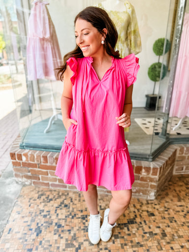 Find your summer love in this hot pink denim romper!! This romper features a cap style sleeve with a classic collar neckline. Down the front of the...