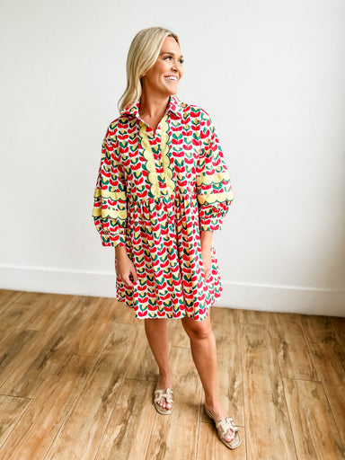Our “Daisy daze dress” is a pretty pick as we transition into the new season! This mini length dress features a short puff sleeve with black appliq...