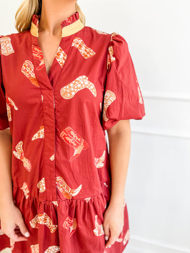 This dress is all about the "boots & beauty!!" It features a short puff sleeve with a split neckline. The dress has a cowgirl boot print on a l...