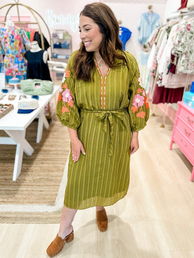 Our “embroidered blooms” midi dress is the pop of color you need in your fall wardrobe! It’s has embroidered bright florals on the sleeves and a v ...