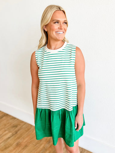 Our “fine line dress” is an easy throw on and go option! It is a mini length sleeveless dress with a crew neckline. The green & white stripe pa...