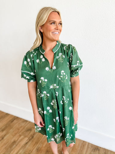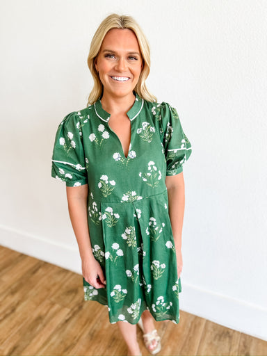 Our favorite "bouquet of blooms!" This midi length dress is covered in fall florals! It has a short puff sleeve and a high neckline dressed in ruff...