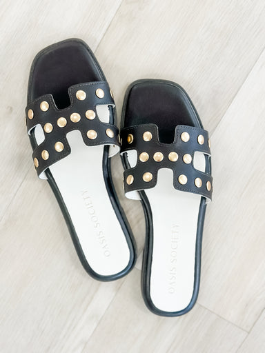 The Evelynne Studded slide will be your new go to this fall season! The H band slide is covered in gold studs for a cute and edgy look. It has a sm...