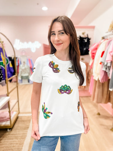 Mardis Gras is all about the mask and the magic they bring! This white tee is covered in masks made with sequins in purple, gold, and green. It has...